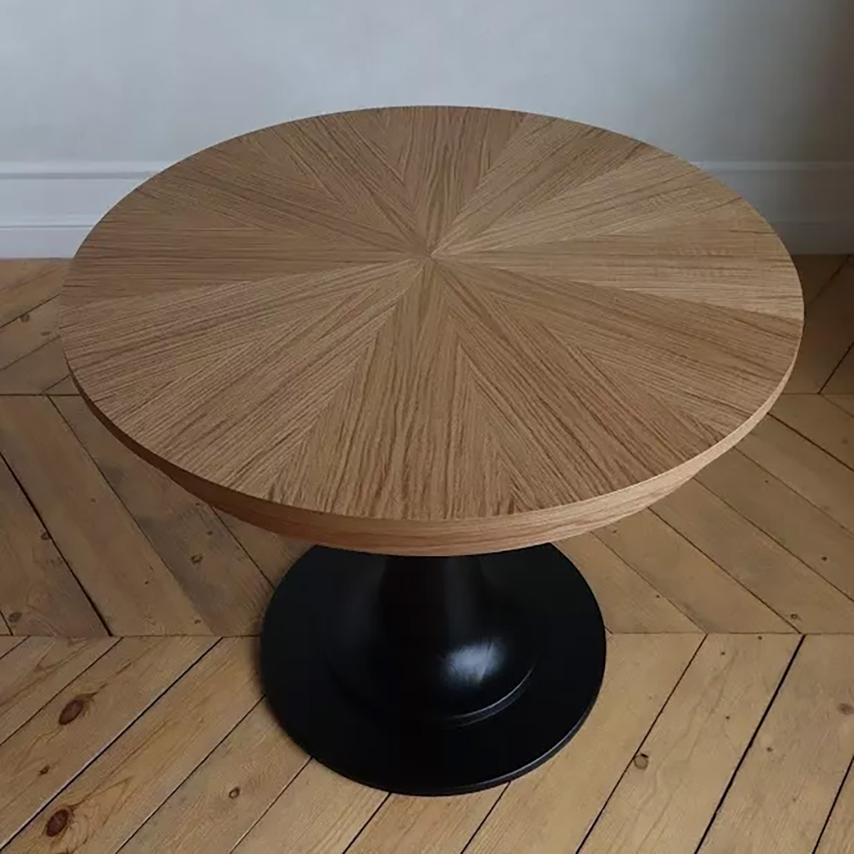 Точеная ножка стола выполнена из массива и покрыта черной эмалью, что придает ему современный вид. Раскладка шпона на столешнице выложена лучами, что является изысканной деталью. «STL 05» станет не только функциональным предметом мебели, но и стильным украшением вашего дома.