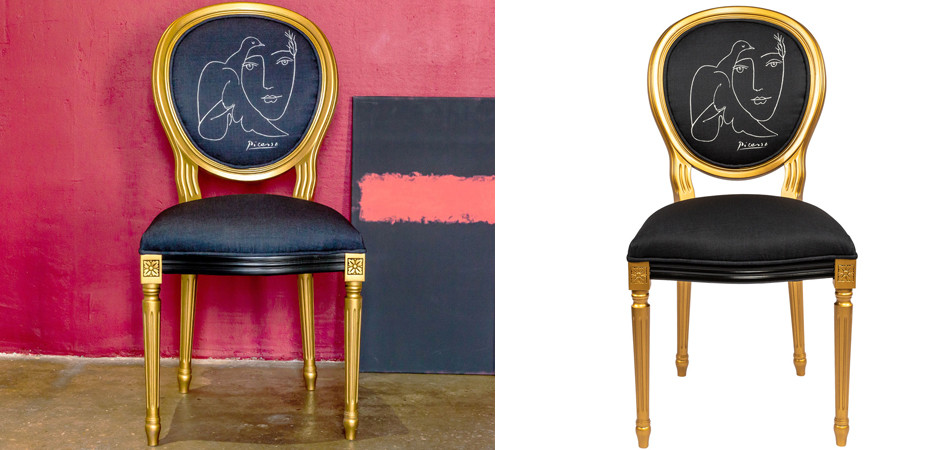 Основной особенностью стула является его спинка, которая выполнена в виде силуэта женщины и белой голубки. Такой дизайн придает стулу особую элегантность и изысканность.