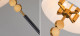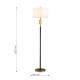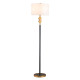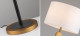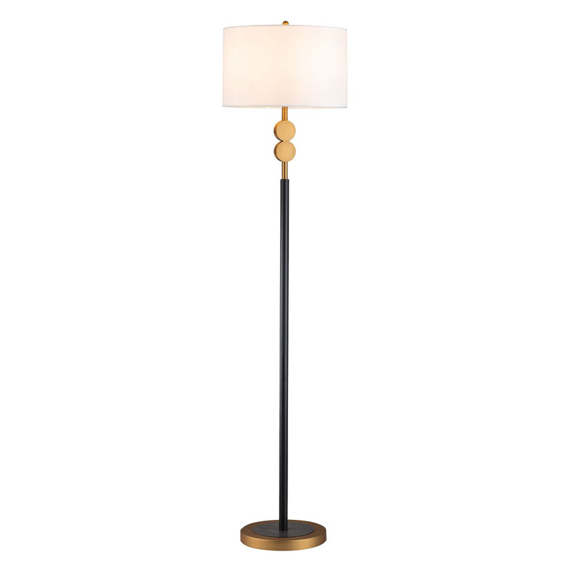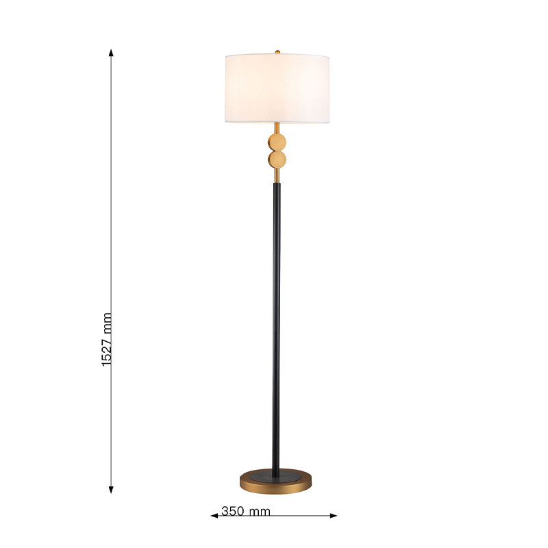 Черный каркас с коричневым основанием, плафон из белой ткани, латунный декоративный элемент в виде двух кругов.