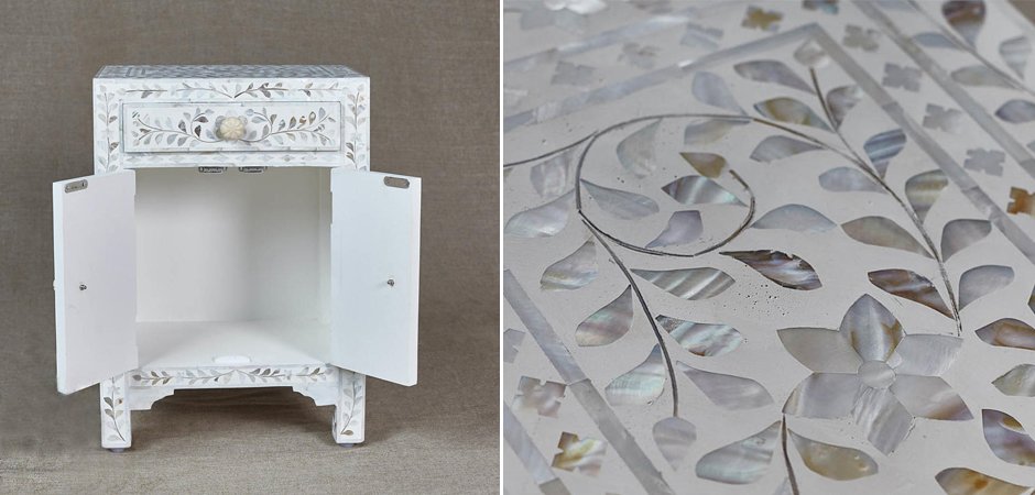 Купить тумбу инкрустация перламутром Inlaid Bone Soft pearl – это выбрать вместительный предмет мебели. Так как один выдвижной ящик и полки – предоставляют достаточно места для хранения различных вещей.