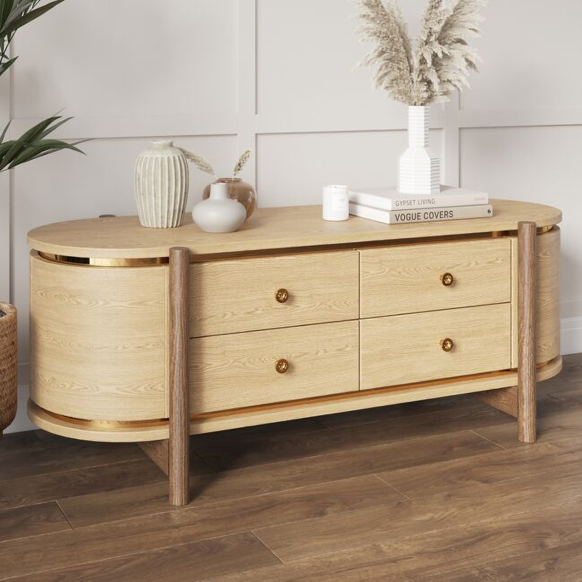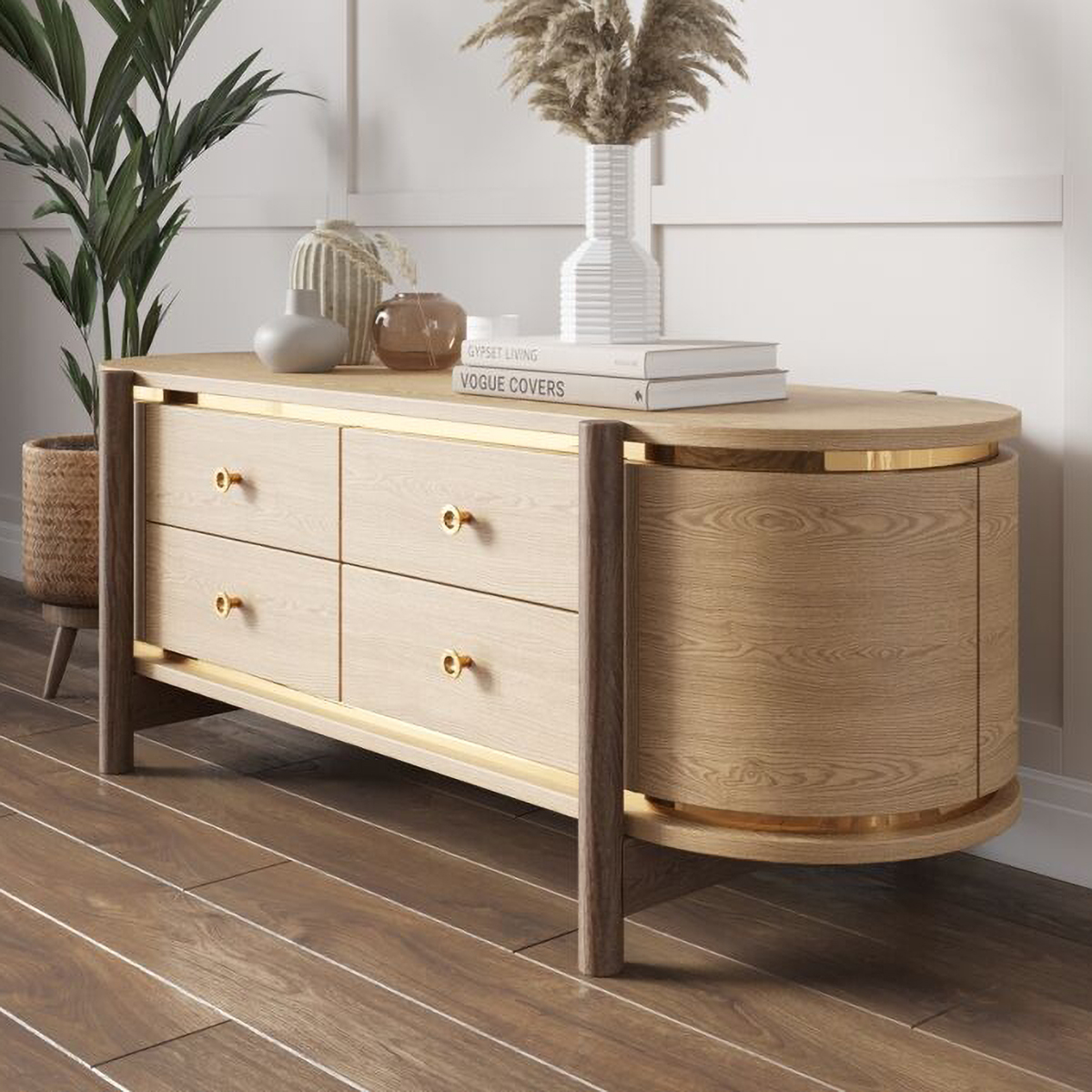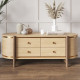 Тумба выполнена из МДФ в шпоне дуба, опоры выполнены из цельного массива натурального дуба. Конструктивно, изделие имеет четыре ящика и места для хранения по бокам. Тумба покрыта прозрачным маслом. На корпусе имеется декоративные вставки. Во всех наших изделиях используется австрийская фурнитура "Blum" с доводчиками, а в работе применяем сверхпрочный американский клей.