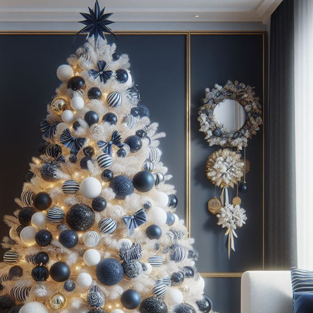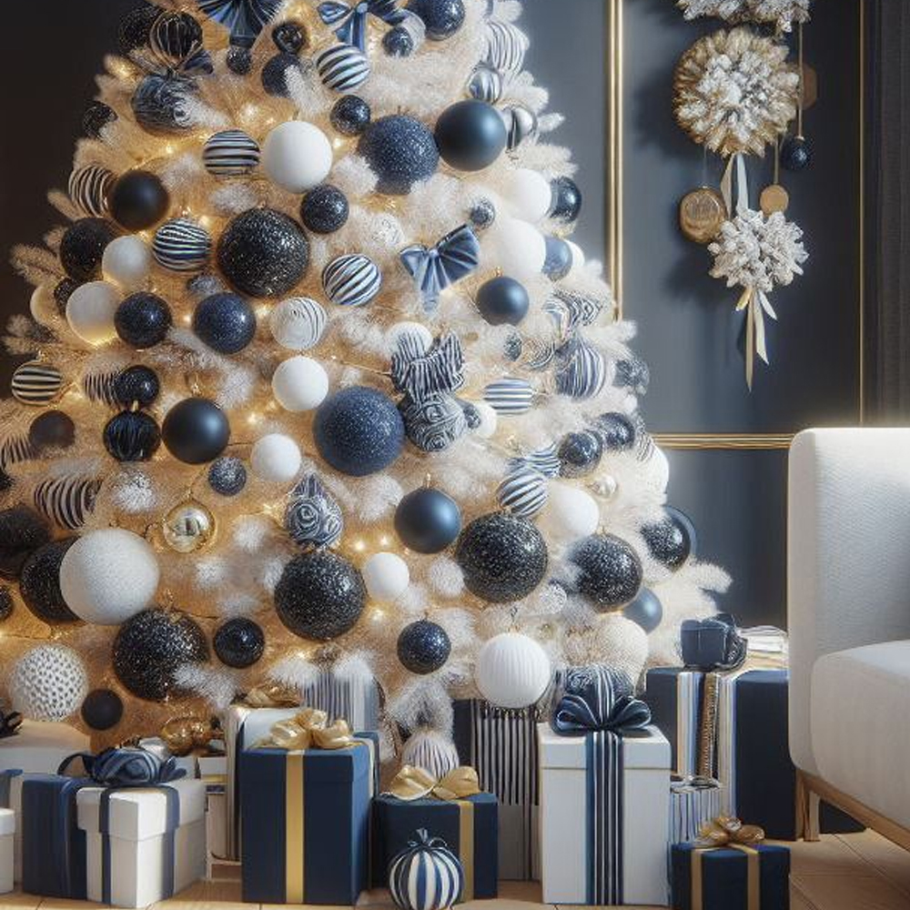Украшенная Белая Новогодняя Елка с сине-белыми шарами и и муляжами подарков в комплекте