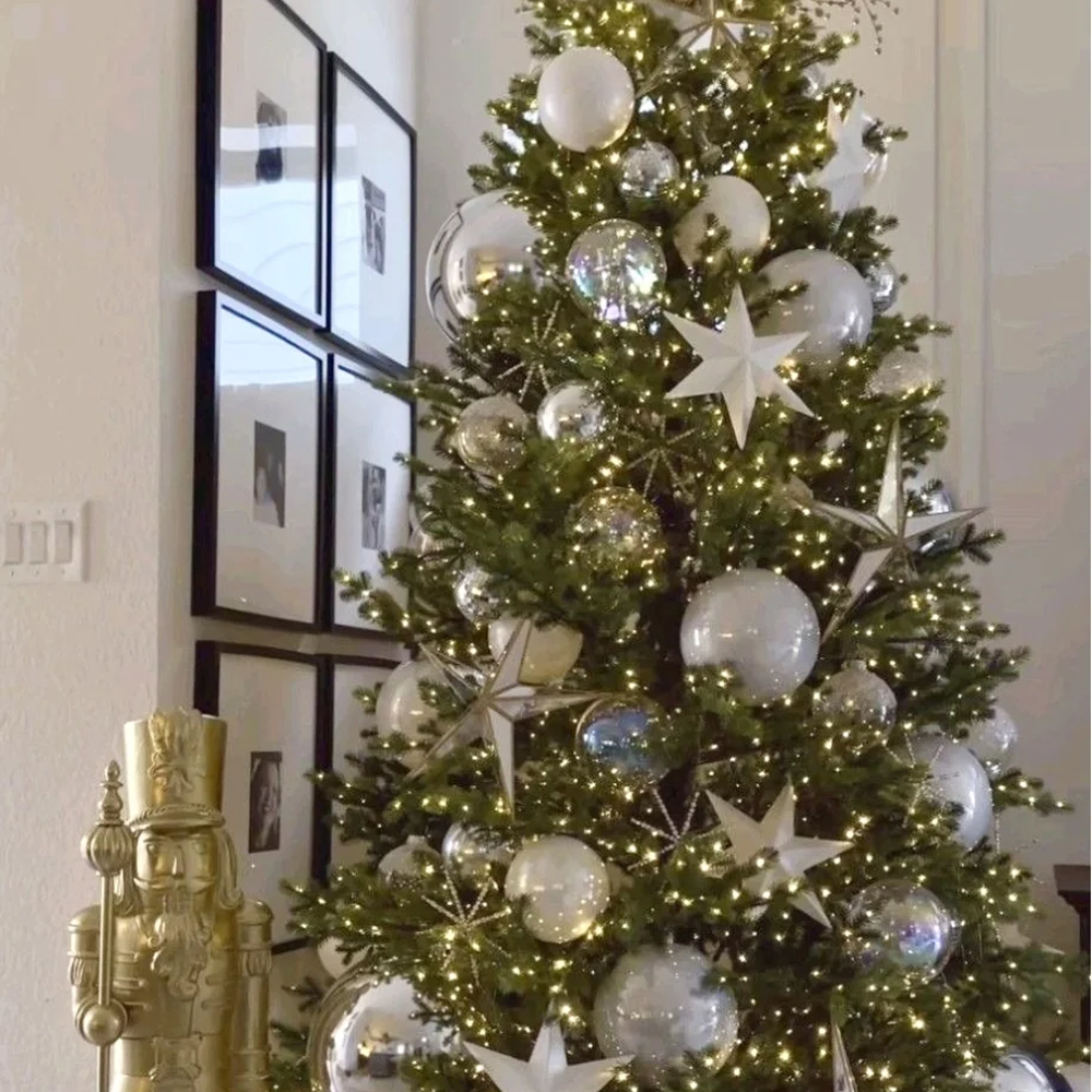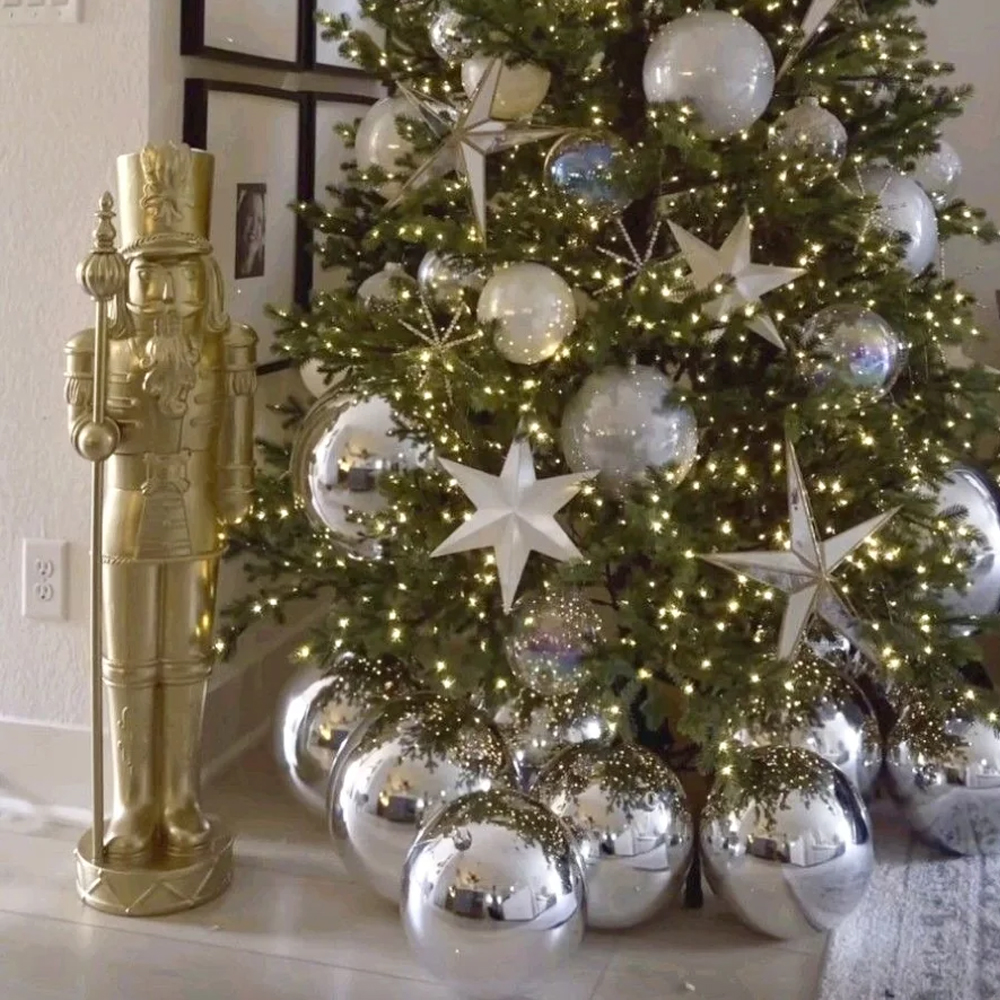 Украшенная Новогодняя Елка с серебряными шарами и звездами