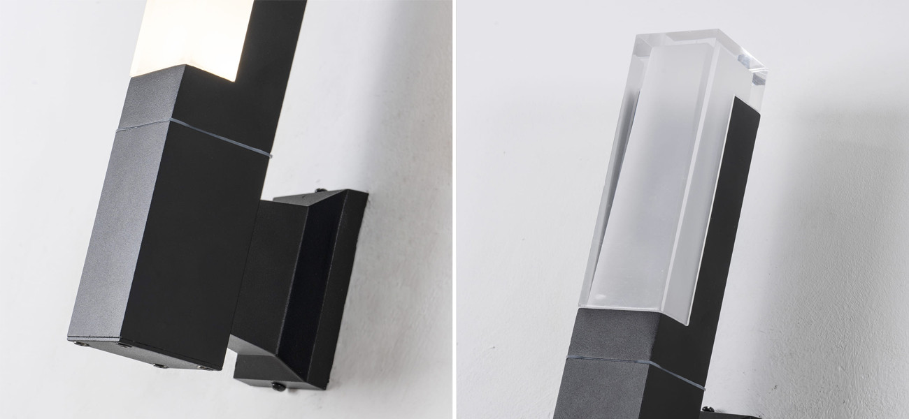 Уличный настенный светильник; металлическое основание черного цвета; плафон из акрила, за счет белого покрытия внутреннего слоя акрила, свечение мягкое, рассеивающее и, при этом, достаточно хорошо освещает.