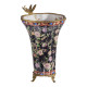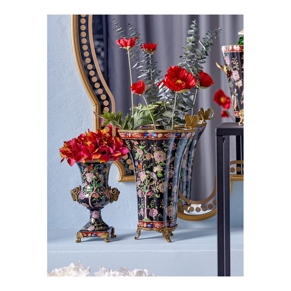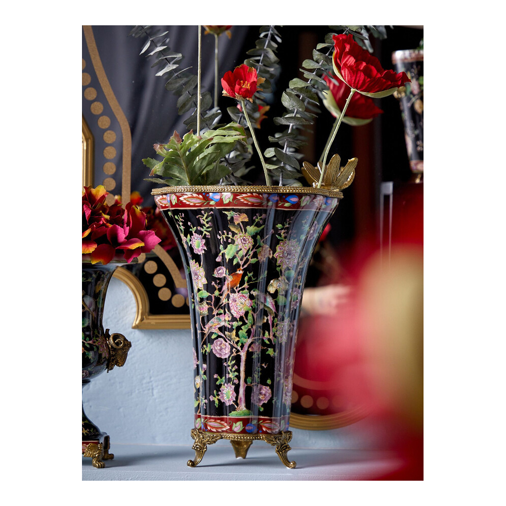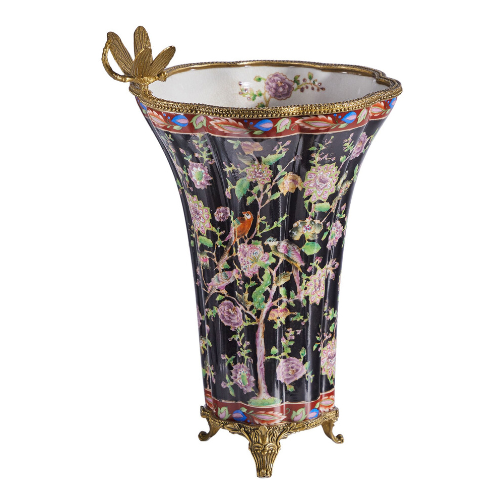 Ваза из фарфора черная с цветочной росписью и бронзовой стрекозой Spring Garden