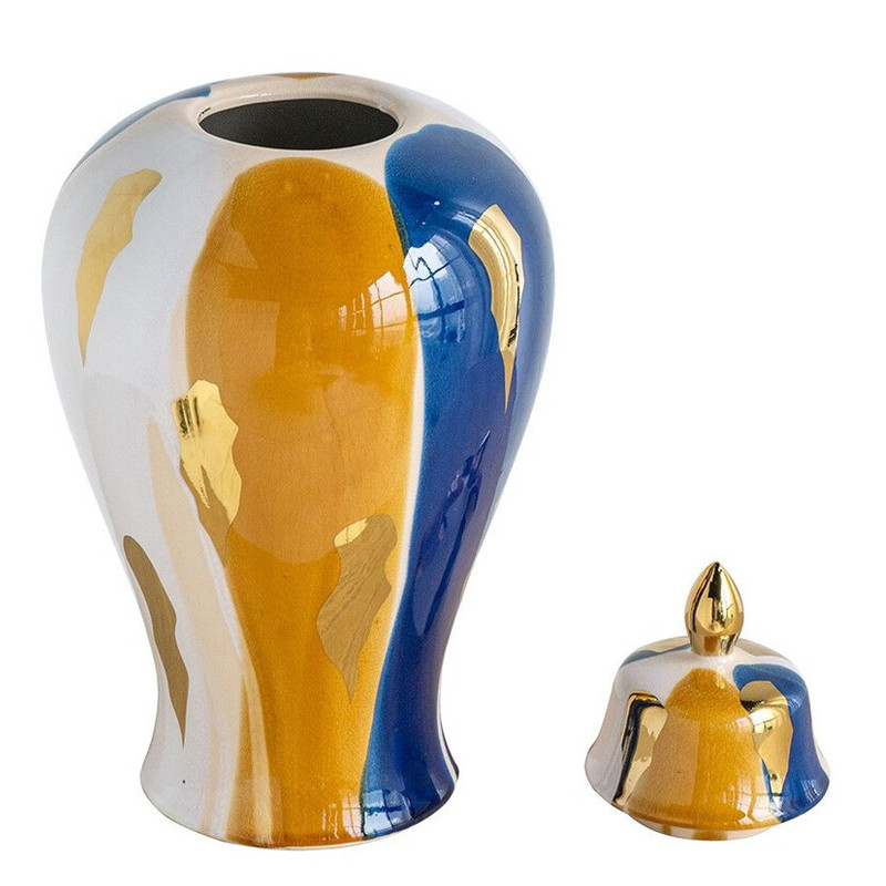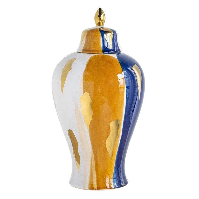 Ваза с крышкой и мазками синего и золого цвета на белом фоне Chinoiserie Ceramics