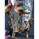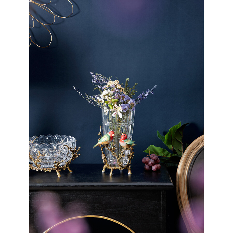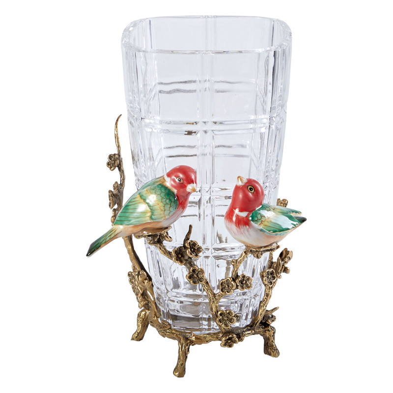 Ваза стеклянная прозрачная с бронзовым основанием в виде ветвей и фарфоровыми птичками Eden Garden