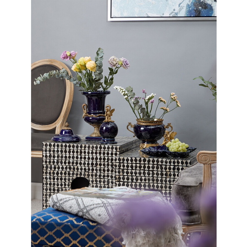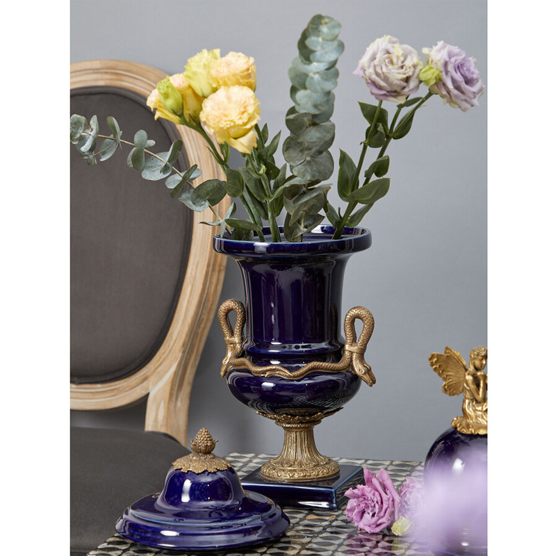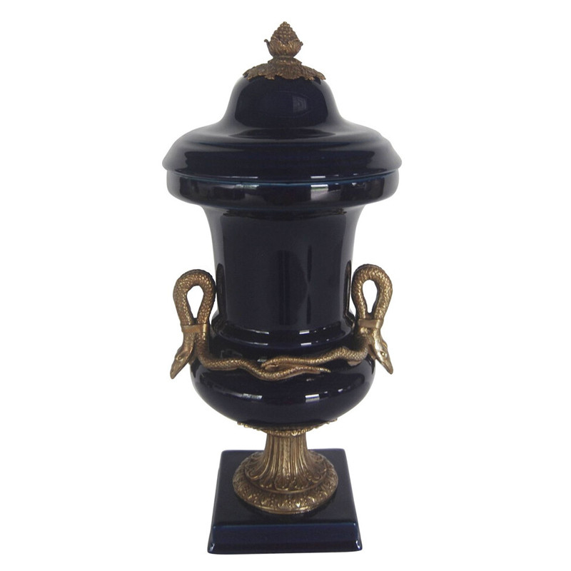 Ваза темно-синего цвета из фарфора с бронзовыми ручками в виде змей Высота 39 см Eden Garden porcelain and bronze