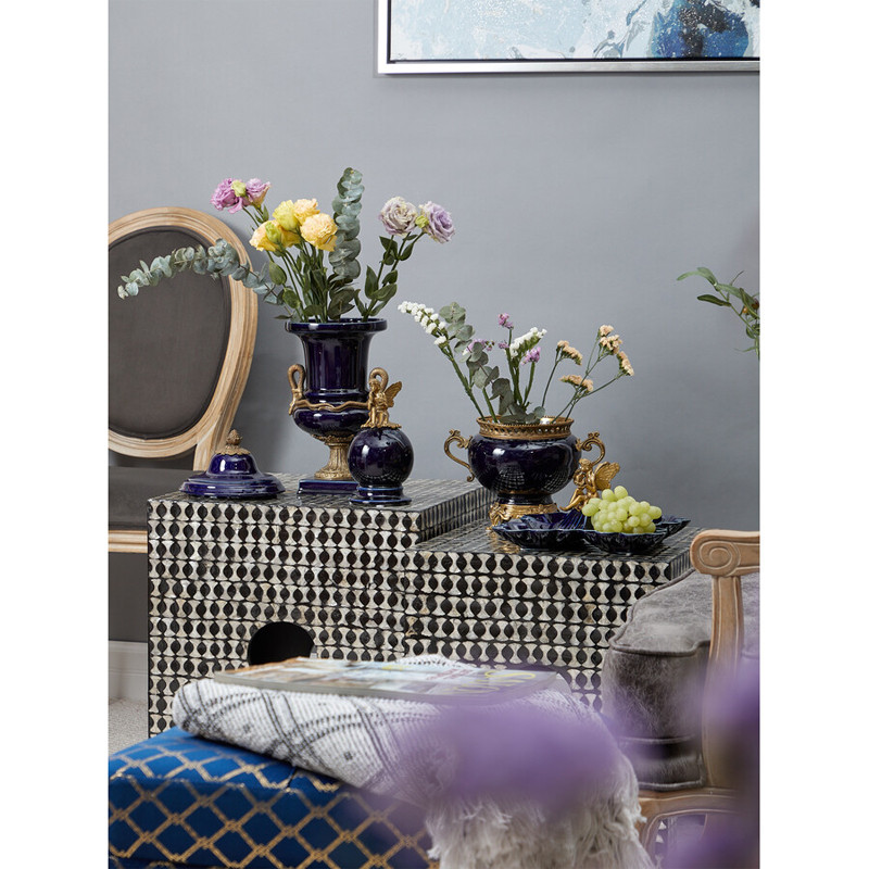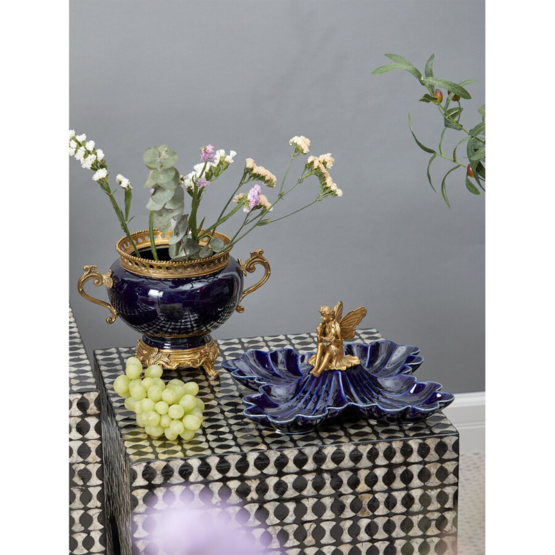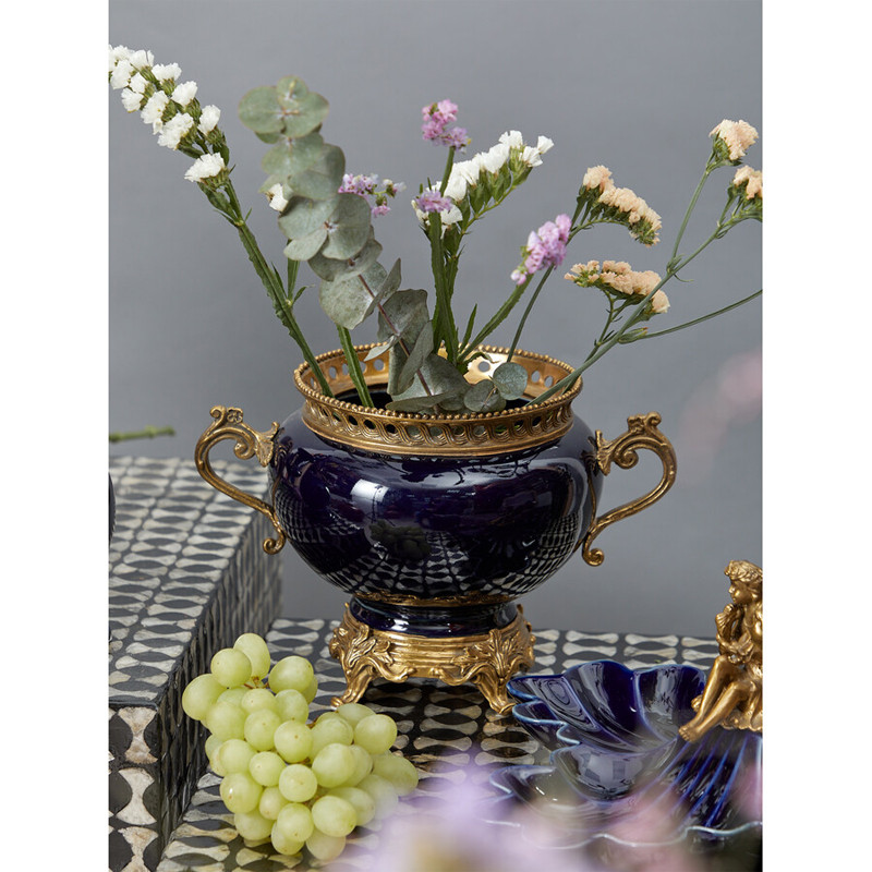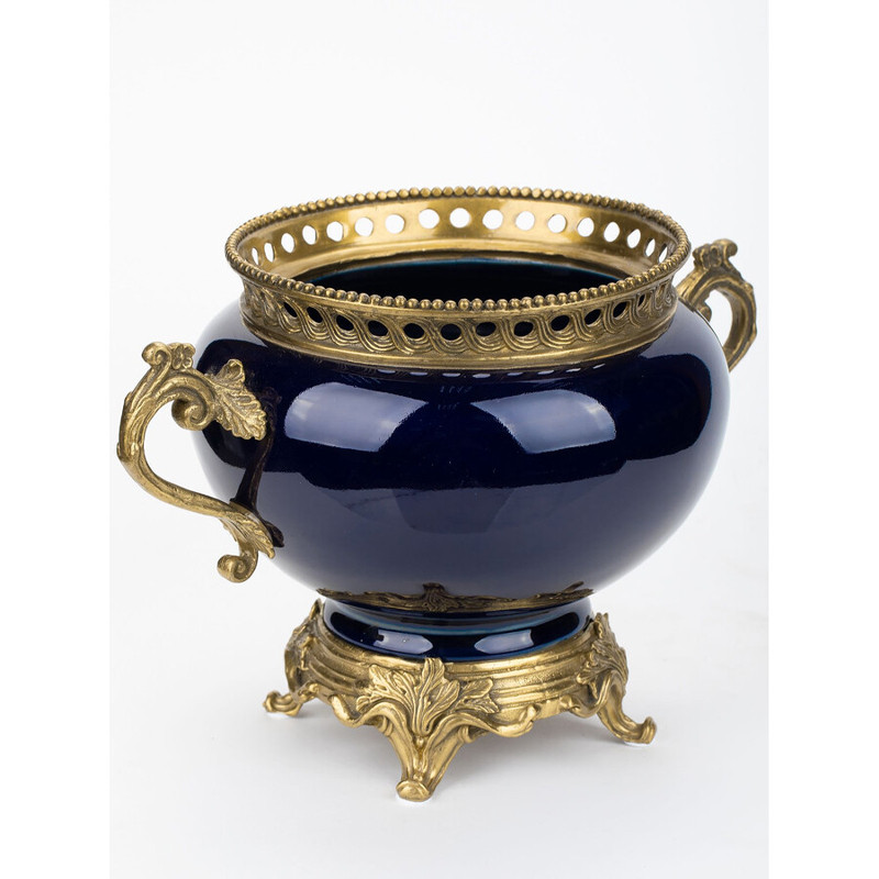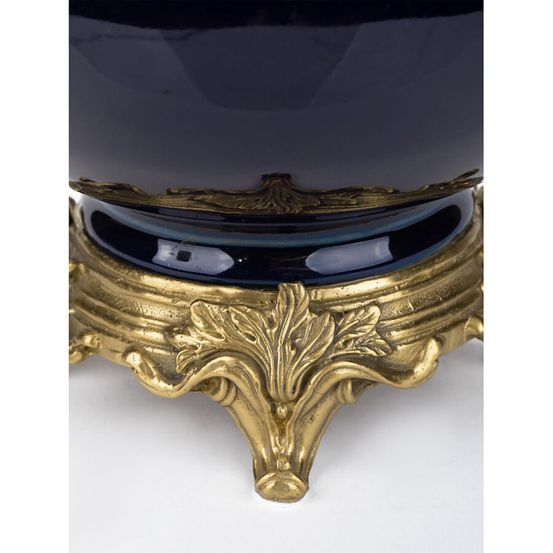 Ваза темно-синяя фарфоровая на бронзовой подставке с ажурным ободком и изогнутыми ручками Eden Garden