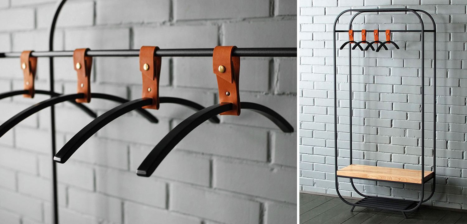 Непадающие плечики от PotemkinBuro для одежды с держателем из натуральной кожи. Легко расстегиваются и застегиваются, выдерживают тяжелые вещи. Стильно, просто и функционально!