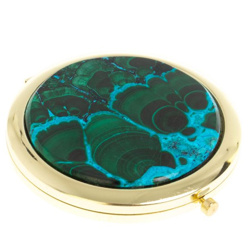 Зеркало карманное складное круглое из натурального камня Малахит с Хризоколлой в подарочной упаковке Gold Stone Mirrors