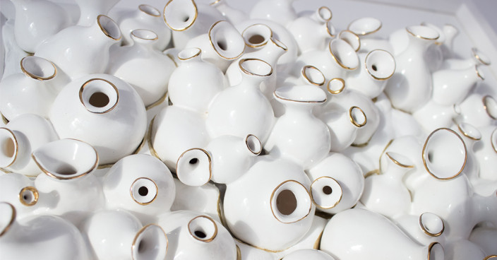 Юлия Соколова - художник керамист. Использует в своих работах такой прием, где керамический кувшин является модулем, средством выразительности, при помощи которого она формирует различные многомерные, динамические композиции, тем самым создавая новую художественную реальность между человеком и миром вещей.